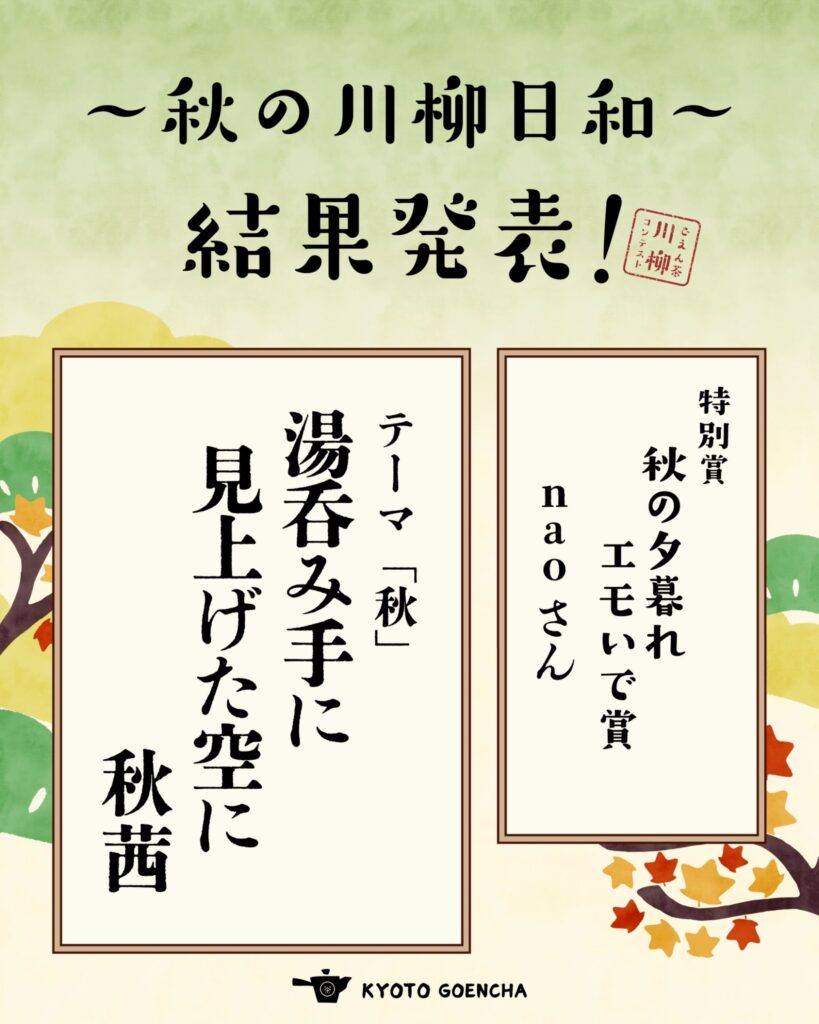 それでは、栄えある「秋の川柳日和」受賞作品をご紹介いたします〜〜!
