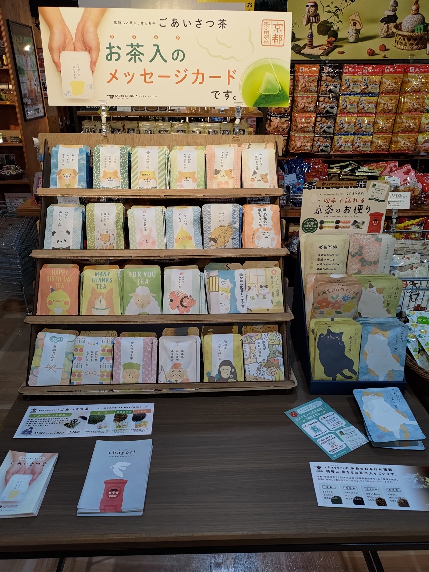 お茶入りメッセージカード「ごあいさつ茶」とお茶のお便り「chayori」をずらりと展開いただいていますよ。